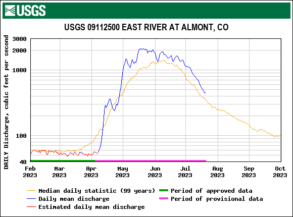 In terms of volume, where large snow accumulation had occurred (so much so as to override any potential losses such soil moisture, sublimation, etc.), higher streamflow volumes were expected. The final water supply amounts for April-July ended up being: Navajo-163%, Vallecito-142%, Animas-138%, McPhee-207%, Powell-166%, Gunnison Basin-115% to 140%, and North Fork Gunnison-180%. Detailed volume information is available on the CBRFC website.