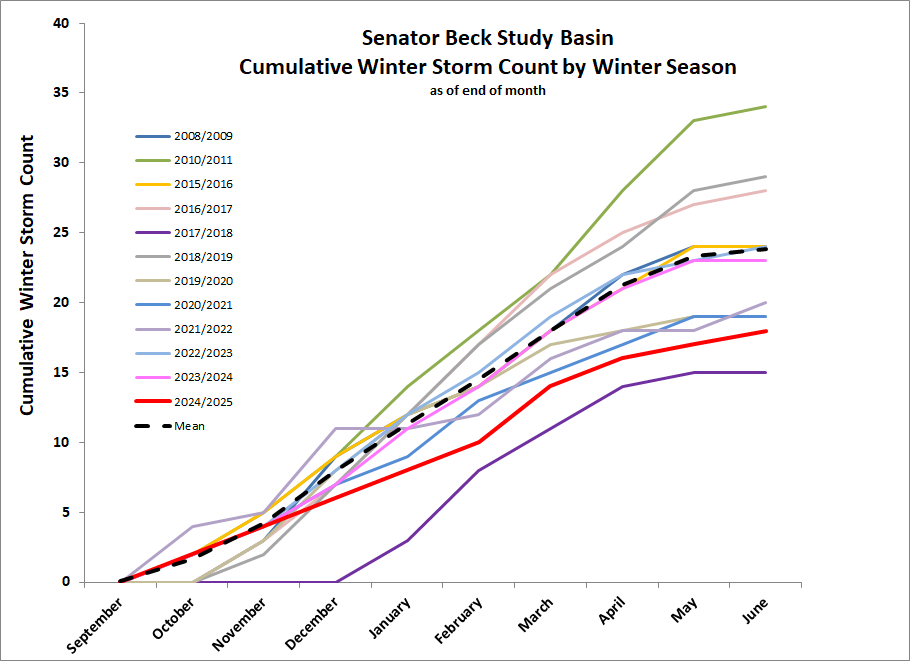 All total we received 20 storms, just under average for our season. A storm is defined as receiving 12 mm (0.5”) or more of precipitation with no break in precipitation greater than 12 hours. Winter storm reports can be viewed at the snowstudies.org website.