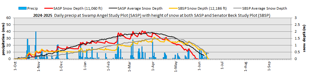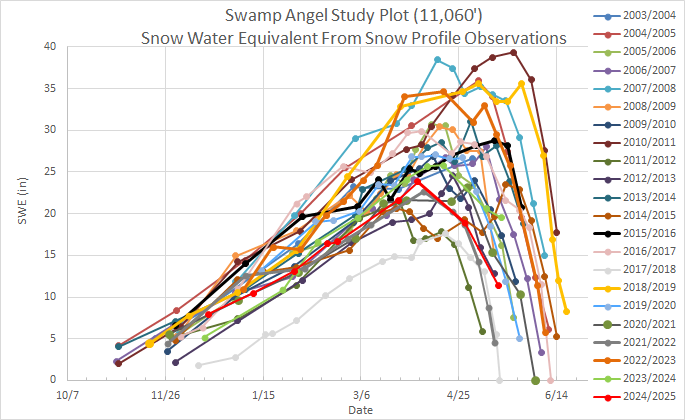 Above: Snow water equivalent at Swamp Angel from snow profiles.