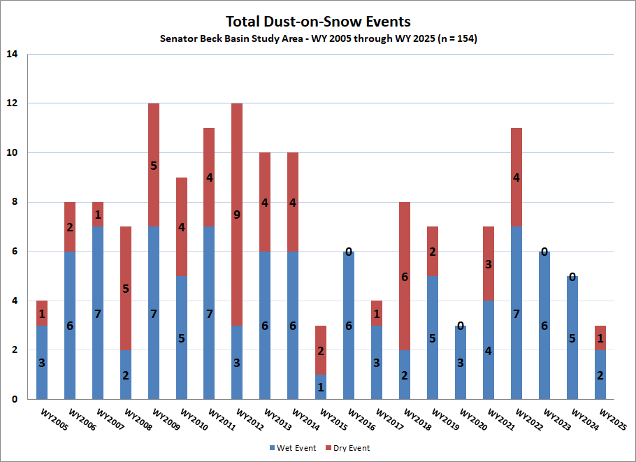 Above: Total dust-on-snow events by year. Two dust events in 2024/2025 were “wet” events and none were “dry” events. Wet means the dust came in with precipitation. Dry means it arrived without precipitation.