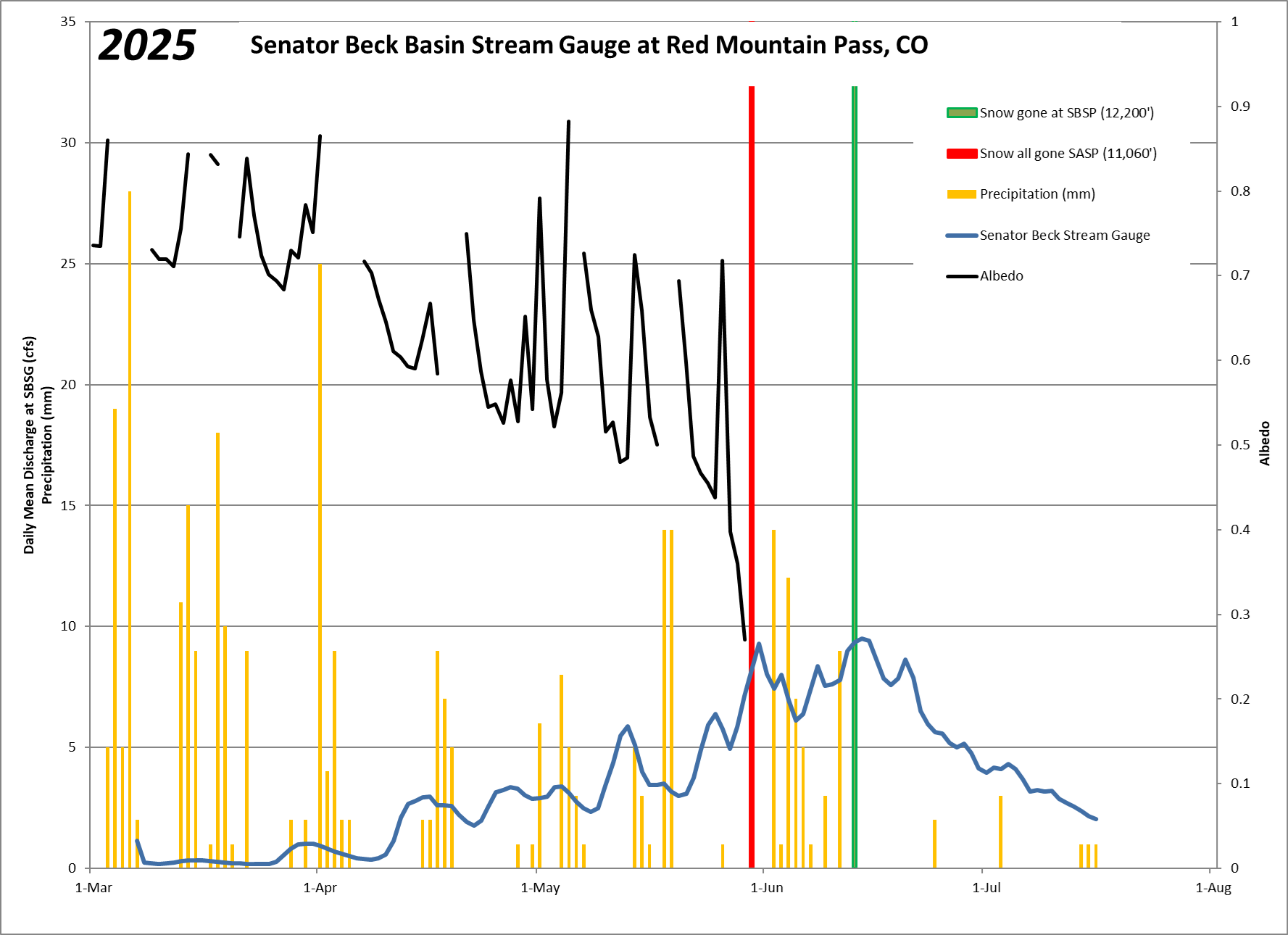 Snowpack and dust-on-snow conditions set the stage for streamflow come springtime, and weather conditions dictate how it unfolds. As has been the case for the last several years now, a big question was just how much a hot and dry April would advance ablation of the snowpack. That month played out with slightly above normal temperatures on average and very dry conditions throughout the state (only two storms at SBB). Lower severity dust-on-snow conditions kept the snowpack in place longer than expected, nonetheless, streamflows saw a solid uptick until mid-month when a modest storm came through and provided an albedo reset and brief cooler temps. A mild storm held things in check the first of May then melt really kicked in with rates of >1”/day. Another mid-month May storm tapped the brakes and dropped streamflows below median. Being mid-May, the snowpack is poised to melt quickly, the well timed storms (albedo resets) and minimum dust conditions already resulted in the snow sticking around longer than expected and streamflows from peaking very early. Nice weather settled in and streamflows ramped up and peaking right around June 3. Many gauges saw a slightly higher peak and/or extended peak due to a rain dominate storm June 4-5. For these reasons the streamflow peak constituted melt out of snow ~11,000’ and below. The higher elevations, still retaining a healthy snowpack in some locations, still had some melting to do. With our Senator Beck weather station being the only one of a small handful of stations above treeline, we knew there was a near normal snowpack up there. The first half of June was wonderfully wet which slowed melt a tad at elevations above treeline. Some higher elevation stream gauges (like SBB) showed sideways movement during this time, but the majority started tapering off. Within a day of snow being gone at the Senator Beck site we saw the high elevation induced peak in our SBB stream gauge, pretty much the same peak Q (9.4 cfs) as when 11,000’ peak occurred. After this, streamflows started receding.