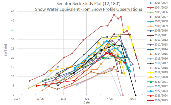 Above: Snow water equivalent at Senator Beck Study Plot from snow profiles.