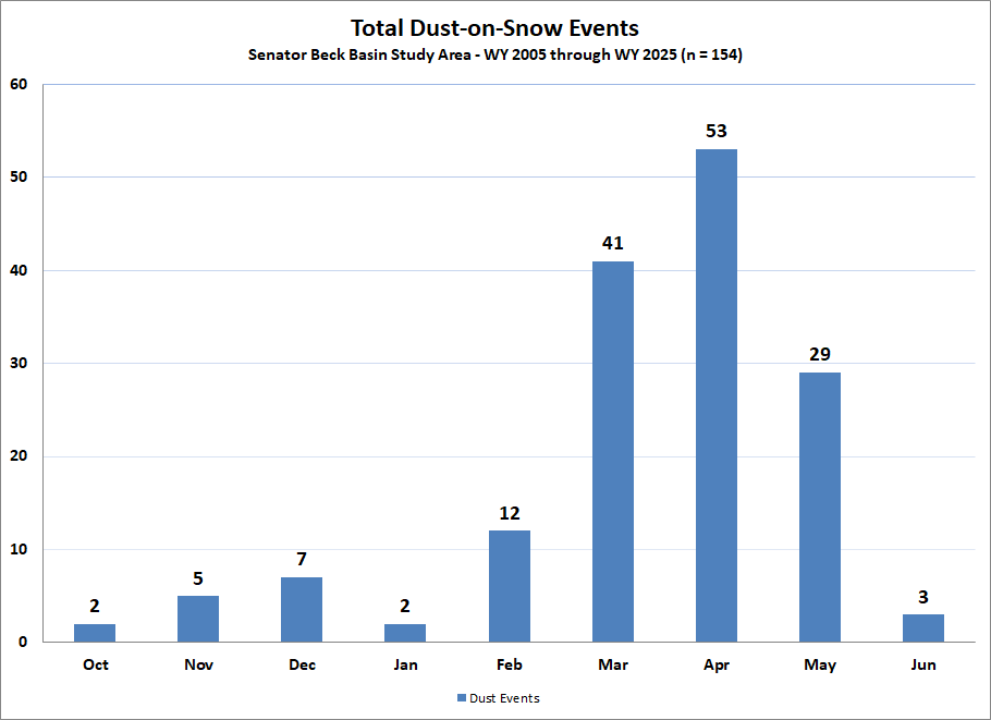 Above: Total dust-on-snow events by month. March begins the more intensive part of dust-on-snow season. In WY2025, we saw dust events occur on January 25-26th, March 18, and April 1.