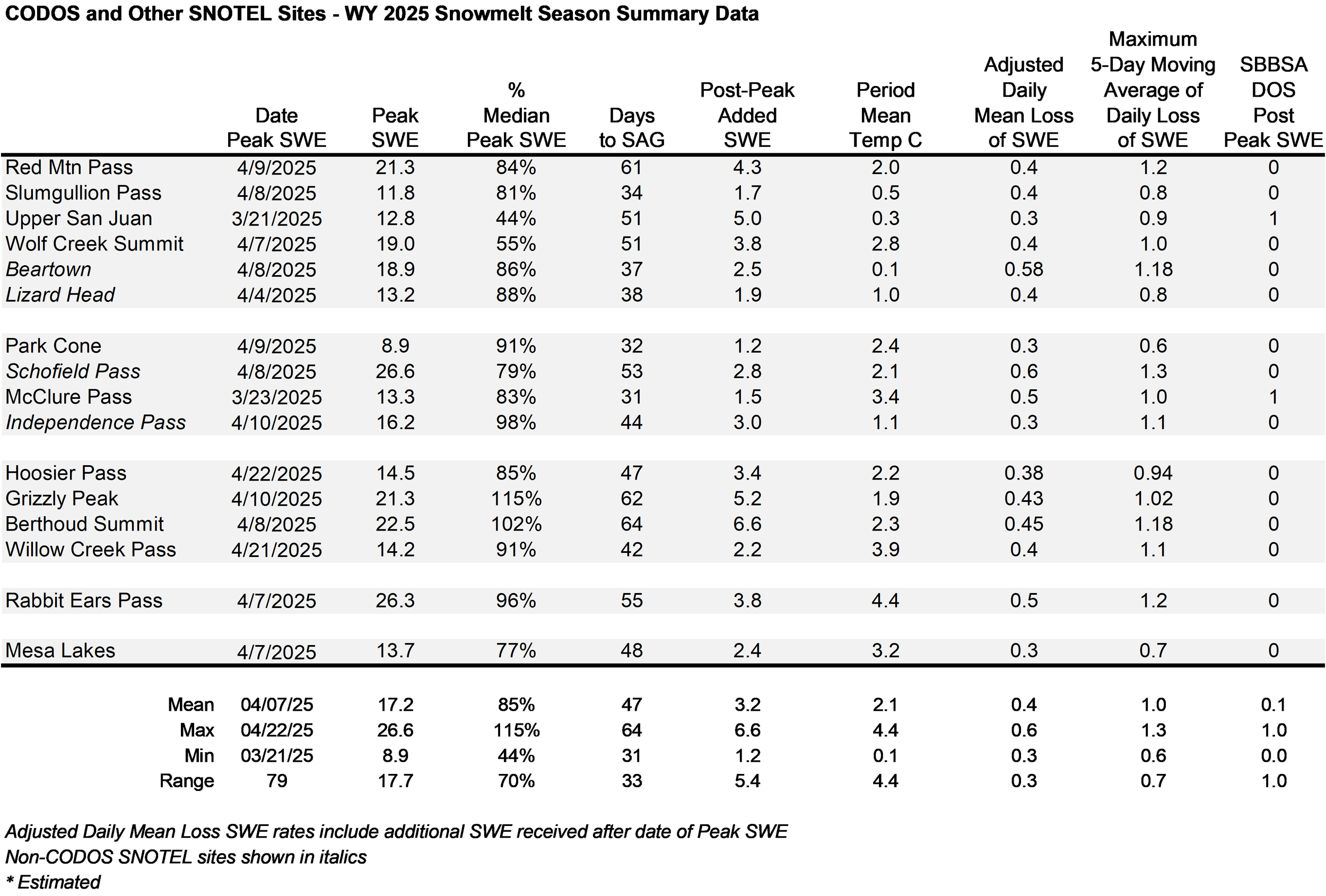 Below: A summary of WY 2006-2025 snowmelt rates and associated conditions at the 16 SNOTEL stations that CODOS routinely monitors. Days to SAG refers to the time between peak SWE and “snow all gone” at the SNOTEL sites. Adjusted Daily Mean Loss calculates the rate of snowmelt following peak SWE, including all precipitation received after peak SWE (assumed to be snow). Melt rate tables are presented for each of the 11 CODOS monitoring sites on their webpages.
