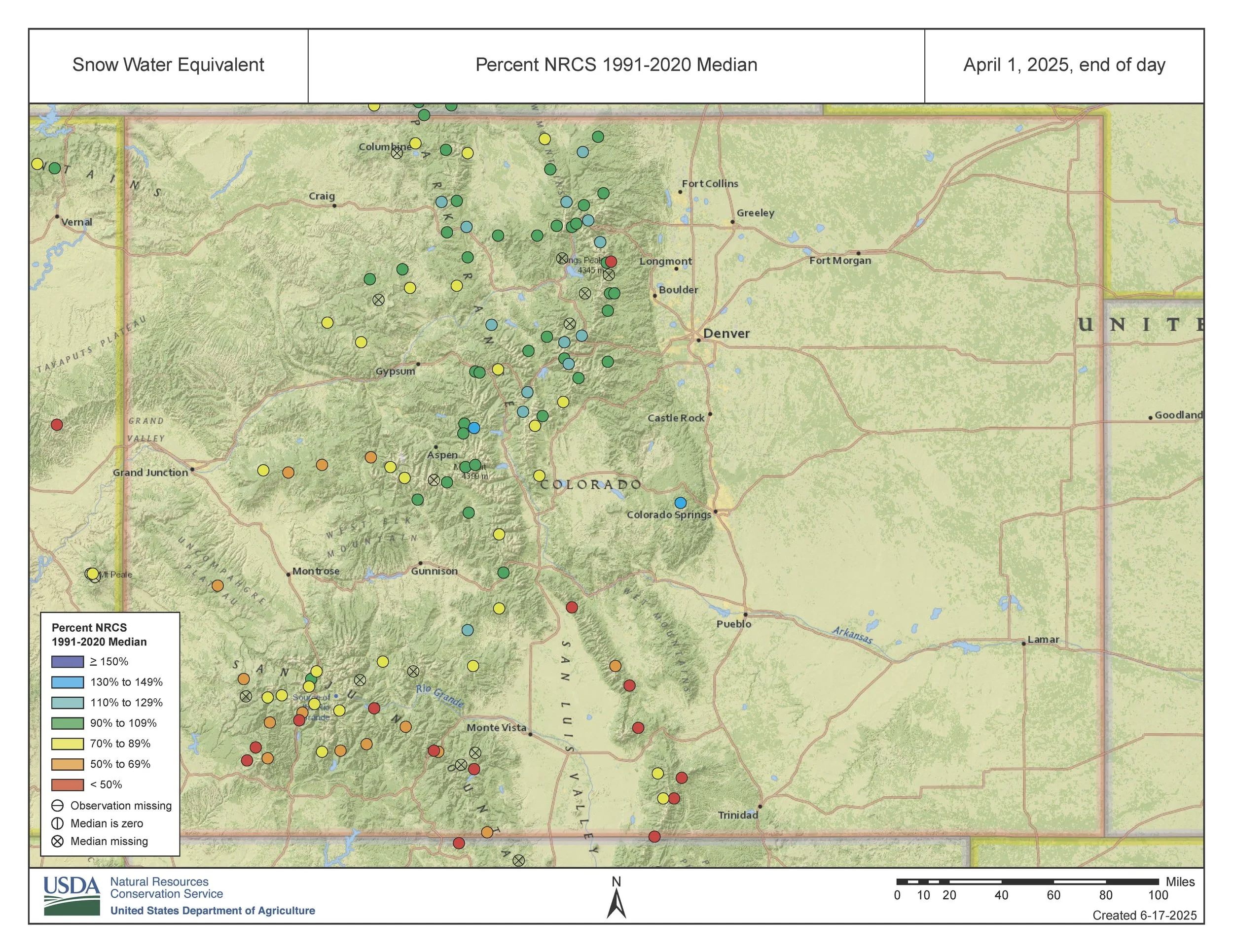 March Weather Summary: Colorado had one of the top ten warmest Marches on record. Most of the state saw near average precipitation, which was good for the northern mountains to hold their SWE, but not enough for the southern mountains to make up lost ground. Notably, the San Juan and Upper Rio Grande basins reported 63% and 56% of normal SWE, and the warm temperatures were hastening the decline.