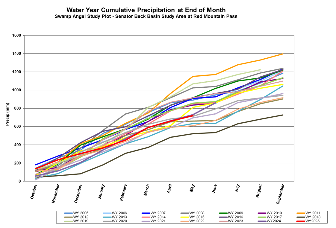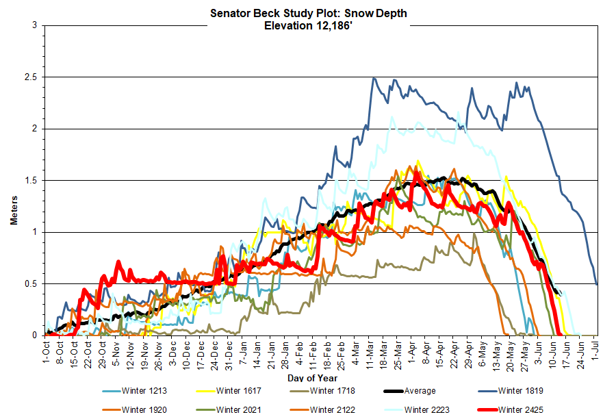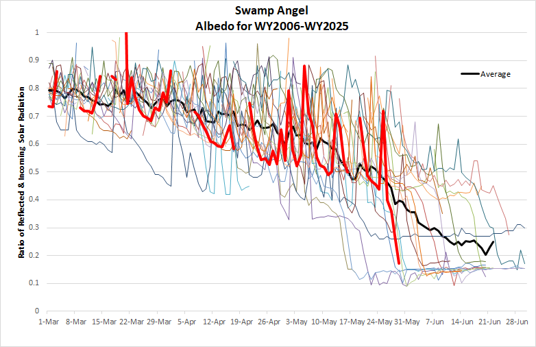 Below: Snow season albedo since 2006. Albedo can vary greatly depending on dust severity and precipitation events. WY2025 (red line) was “lower-end-of-average” for dust severity conditions at Senator Beck. Precipitation events, however light, were rather frequent in spring which helped keep fresh snow (as well as cloud cover) on the surface and minimized dust radiative forcing.