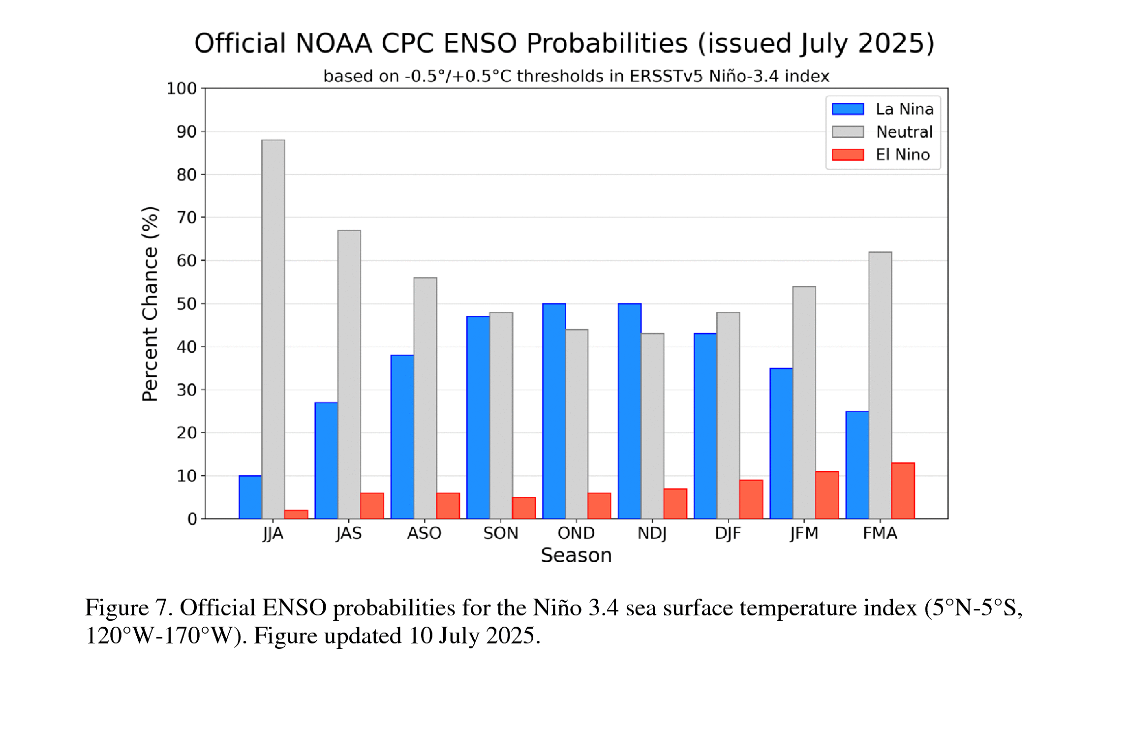 As a reminder, we had close to neutral conditions for this past winter; we never officially hit sea surfaces temperatures of 0.5 °C below average in the Pacific Ocean three months in a row, which would have officially been considered La Niña. In the spring, we shifted from the La Niña-ish winter into neutral conditions, which are expected to continue through late summer. Chances of a La Niña transition increase in fall/winter, but are comparable to the chances of remaining ENSO-neutral. The longer-term outlooks from the CPC are leaning warm and average-to-dry this winter; though of course, we’re a long way out.
