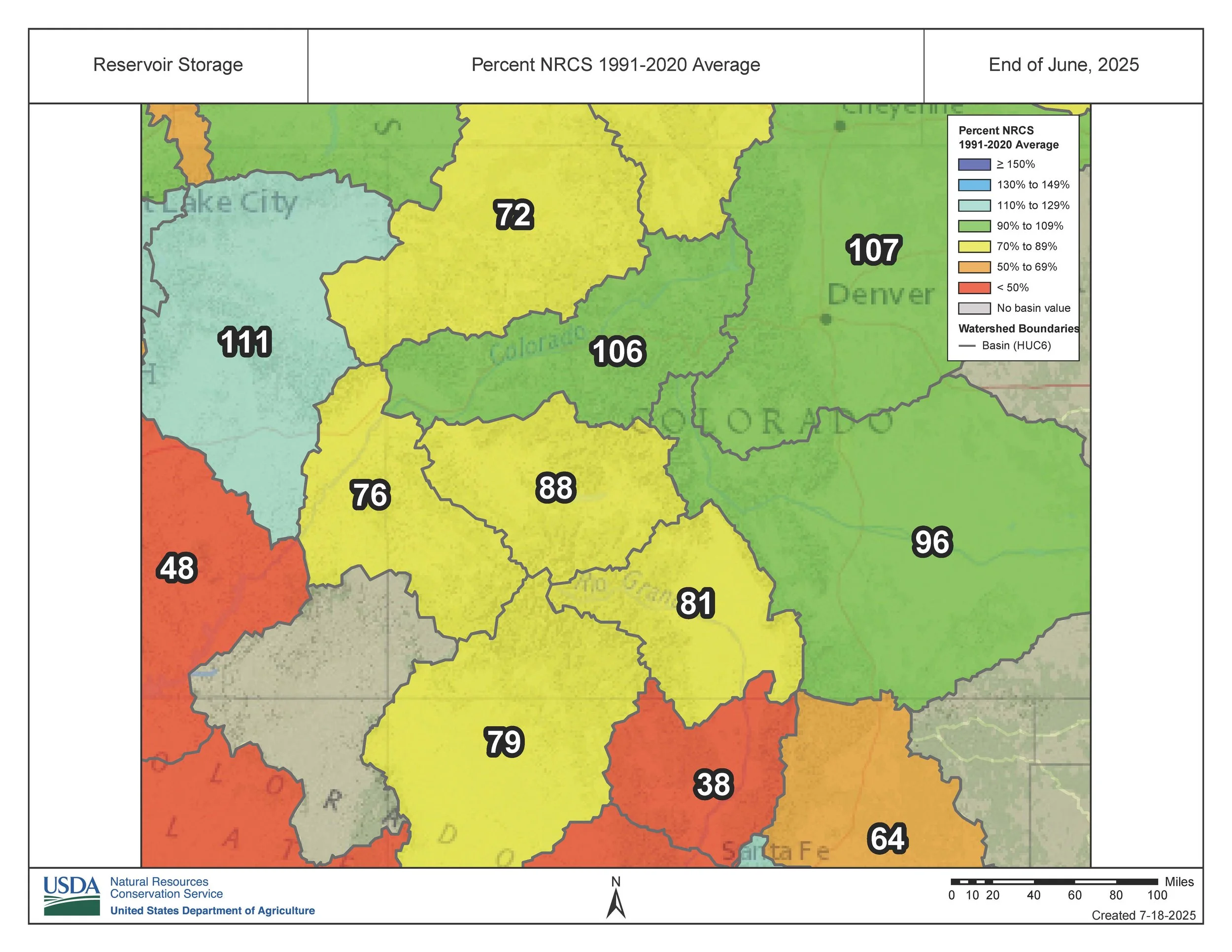 While Colorado had near-normal April 1 SWE conditions the northern half of the state and conditions in the 60-80% in the southern half, by mid-May most basins were at or below 50% of the 1991-2020 median. By July, drought covered the western half of Colorado, and conditions are expected to persist; a wide swath of D3 (Extreme Drought) sits amidst the lesser drought categories (D0-D2). The Climate Prediction Center’s (CPC) Seasonal Temperature Outlook for Aug-Sep-Oct portends a 40-60% probability of above normal temperatures, while the Precipitation Outlook suggests 33-50% chance of below average precipitation for the same time period.