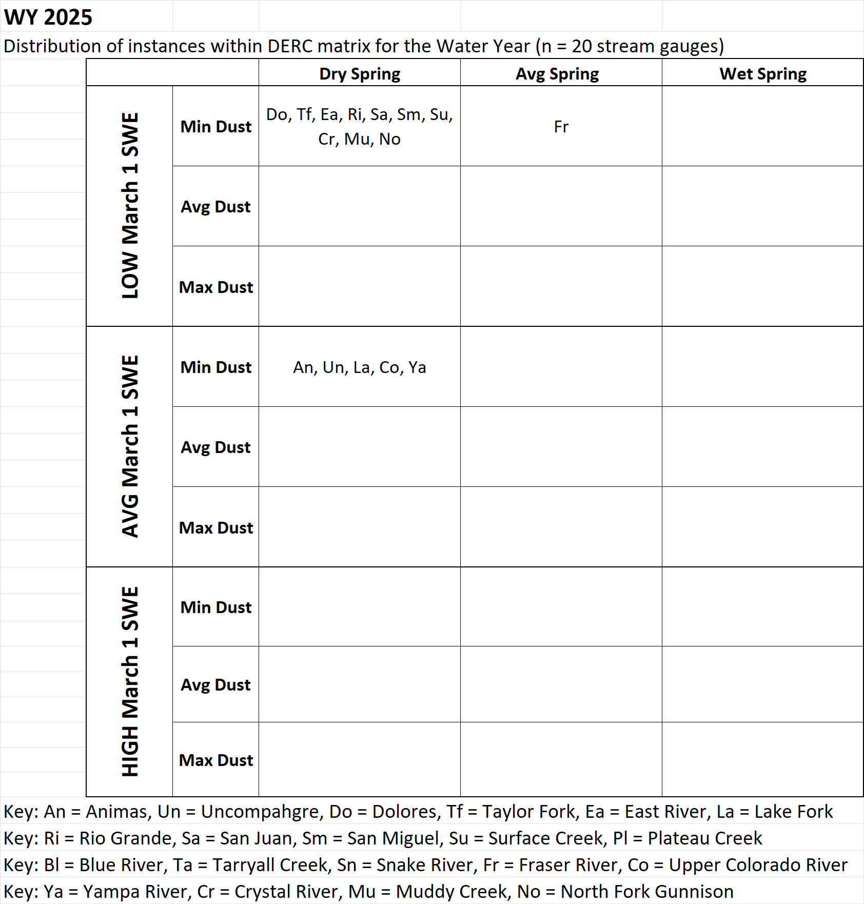 In Water Year 2015 CODOS introduced a Dust Enhanced Runoff Classification (DERC) approach to linking dust-on-snow, snowpack, and spring weather conditions to patterns in statewide hydrographs within a 3x3x3 Dust Enhanced Runoff Space. The below table presents the final DERC classification of WY2025 parameters at each of the 20 stream gauges monitored by CODOS. Water Years 2006-2025 classifications are contained in Excel workbook Runoff_Space_by_Region_and_WY.xlsx. Another workbook, Runoff_Space_by_Watershed.xlsx, contains individual DERC analyses for WY 2006-2025 for each of the 20 stream gauges.