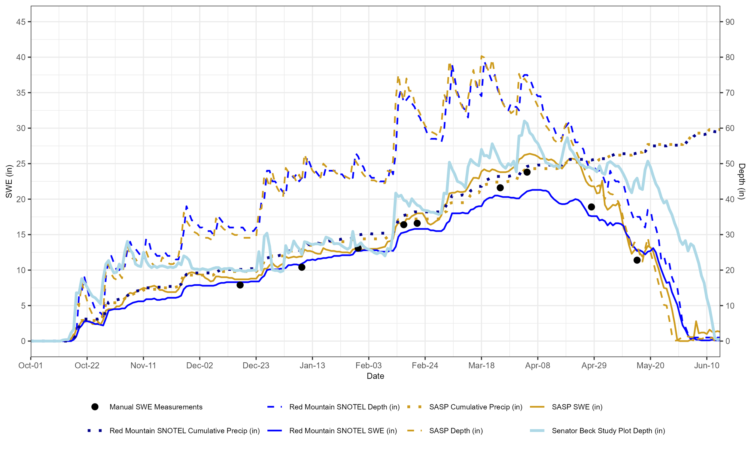 For Swamp Angel, our low precipitation started in December which was just 54% of the average, while January was 53% of average. February was 76% of normal and even though March precipitation was above average (118%), it wasn’t enough to catch us up from three significantly dry months. And even though March delivered somewhat, we also had some very warm temperatures. The spring sun baked us, alternating with a few brief snows, through April. The albedo reset delivered by bits of snowfall was very welcome. Nevertheless, SWE conditions headed south, unable to stand up to that spring sun and warm/dry air. There were a few very small nooks, such as our Senator Beck station, at higher elevations above treeline that accumulated more snow and held onto it pretty well compared to the lower elevation stations. With just a few stations in the high alpine in Colorado, it can be difficult to know what is going on up there, making stations like Senator Beck a very valuable resource for water managers and forecasters.