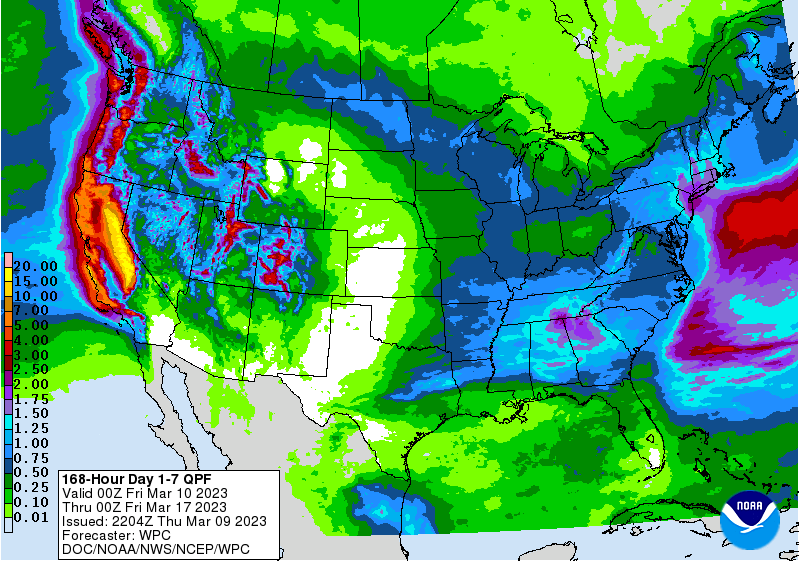 Below: Impressive snow totals forecasted from the storms this week, check out AR activity in California!