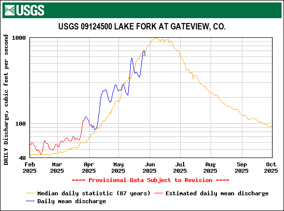 Snowmelt is always the most interesting time of the season. Here in the southern part of the state streamflow really kicked into action around May 10 and kept climbing for the next four days until a significant storm rolled through starting May 14 and continued until May 19. These 6 days of cooler temperatures accompanied by 1.5” of precipitation arrested snowmelt for a 3-4 days following the event. Beginning around May 21 streamflow steadily climbed for a week to a new peak. On Monday, May 26, a blustery rainy/snowy day slowed down snowmelt (hence streamflow) slightly once again. Today we are seeing streamflow pick back up.