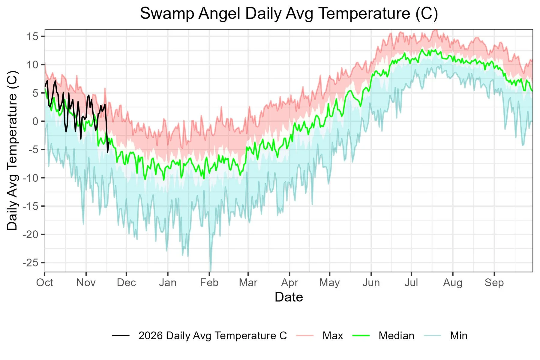 Our first winter storm arrived at Senator Beck Study Basin a bit more than fashionably late this year. The storm began Saturday afternoon with the most intensity, and continued snowing intermittently through noon on Sunday. Swamp Angel Study Plot recorded 0.74” precipitation, and about 6” of snow depth. The winds came primarily from the southwest. We issue a storm report when we receive at least 12mm (0.47”) precipitation with no break in precipitation greater than 12 hours. You can see all of the reports for the season here. It is looking like we will be issuing another storm report here in a day or two.