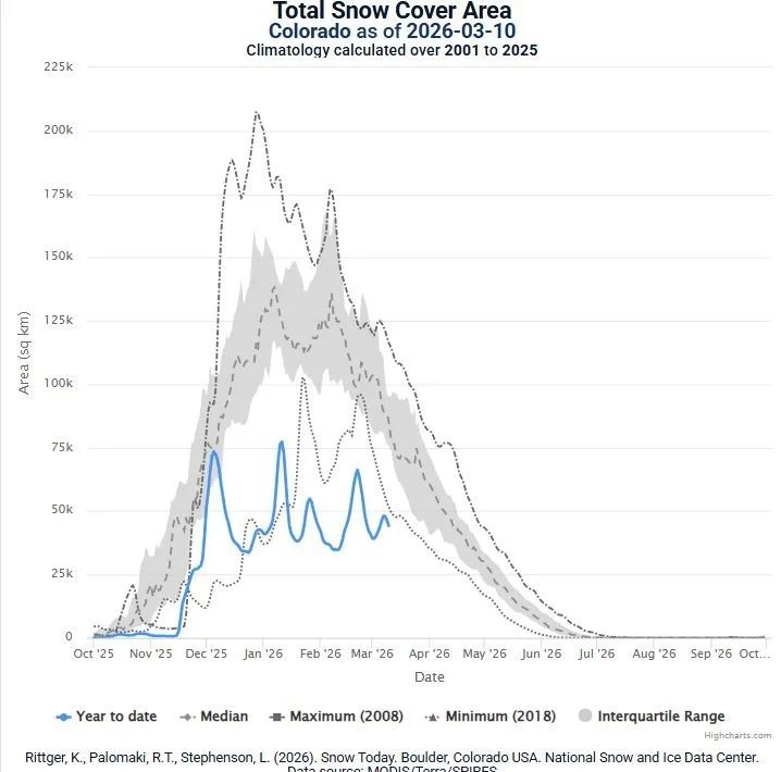 Some SNOTEL basin plots show a good comparison with WY2018, another very dry year particularity for the Southern Basins. This may be the case for this but a big difference that makes WY2026 more severe is snow covered area is much less due to snow falling as rain and also it has been consistently much warmer, possibly the warmest on record. This double whammy of warm/dry of course means no snow that would typically see at lower elevations because the precipitation fell as rain initially or melted after falling as snow. And it doesn’t end at lower elevations as there is a lot of bare ground on southerly aspects and elsewhere up higher.